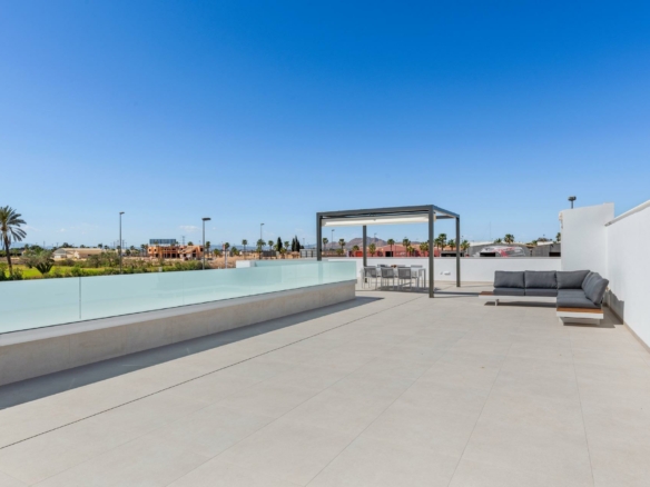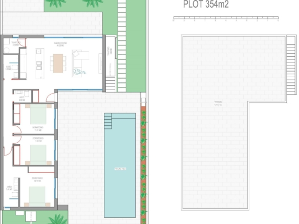 Villas neuves près du Serena Golf à Los Alcazares Villas modernes dans un emplacement privilégié en bord de mer et près d’un golf Ce projet résidentiel exclusif propose des villas modernes situées à Los Alcazares, à proximité du prestigieux Serena Golf et à seulement 1,2 km des plages de sable de la Mar Menor. Situées dans l’une des zones les plus attrayantes de la région de Murcie, ces maisons allient un design contemporain, le confort et un excellent emplacement à proximité de la mer, du golf et de tous les services quotidiens. Los Alcazares est une ville côtière bien établie, connue pour son style de vie détendu, sa longue promenade, ses sports nautiques et son climat doux tout au long de l’année. Conception de plain-pied avec espaces extérieurs privés Le complexe comprend des villas élégantes de 3 chambres et 2 salles de bains, disponibles en deux tailles différentes d’environ 106 m² et 130 m². Le modèle plus grand comprend également des toilettes supplémentaires pour les invités. Toutes les villas sont conçues sur un seul étage, offrant un cadre de vie pratique et confortable. La cuisine ouverte, la salle à manger et le salon communiquent directement avec une terrasse et un jardin privé avec piscine, créant un espace idéal pour la vie à l’intérieur et à l’extérieur. Chaque propriété comprend également un solarium privé et un parking sur le terrain. Finitions de haute qualité et équipements modernes Ces villas sont construites avec des matériaux de haute qualité et équipées de fonctionnalités modernes. Les cuisines entièrement équipées sont disponibles en finition blanche brillante ou bois et comprennent des plans de travail en quartz, un évier en acier inoxydable, une plaque à induction avec hotte intégrée, un four, un micro-ondes, un lave-linge, un réfrigérateur intégré et un lave-vaisselle. Les salles de bains sont équipées de meubles, de miroirs, d’éclairage et de sèche-serviettes électriques. Les équipements supplémentaires comprennent des stores électriques dans les chambres, un éclairage LED dans toute la propriété et un système de climatisation complet par conduits de Fujitsu. Piscine privée et confort économe en énergie Chaque villa comprend une piscine privée avec un revêtement en carreaux de céramique bleus, des marches intégrées et un éclairage LED blanc. La piscine est pré-équipée pour l’installation d’une pompe à chaleur. La combinaison d’une climatisation efficace, d’une construction moderne et d’une conception bien pensée garantit un confort tout au long de l’année. Excellente connectivité et distances clés Les villas se trouvent à quelques pas du centre-ville de Los Alcazares et à proximité du Serena Golf. La plage est à environ 1,2 km. La ville de Carthagène, située à environ 20 km, offre une scène culturelle et gastronomique riche. L’aéroport international de Murcie-Corvera est à environ 22 km et l’aéroport d’Alicante à environ 90 km. Plusieurs terrains de golf et marinas se trouvent également à proximité, ce qui rend cet emplacement idéal pour y vivre à l’année ou y passer ses vacances. Votre maison idéale au bord de la mer et du golf Si vous recherchez une villa moderne neuve près de la plage et du golf à Los Alcazares, contactez-nous dès aujourd’hui pour obtenir plus d’informations ou organiser une visite privée.