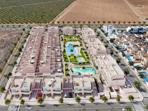 Exclusief nieuwbouwproject in Pilar de la Horadada, Costa Blanca, Spanje Moderne huizen vlakbij de zee Ontdek dit nieuwe wooncomplex in Pilar de la Horadada, een bevoorrechte locatie aan de Costa Blanca. Op slechts 2 km van het strand biedt dit project een grote verscheidenheid aan woningen met 3 slaapkamers en 2 badkamers, met privéparkeergelegenheid bij de prijs inbegrepen. Het project heeft ruime gemeenschappelijke ruimten, waaronder een gemeenschappelijk zwembad, aangelegde tuinen en een kinderspeelplaats, ideaal voor het hele gezin. Verschillende types voor jouw levensstijl Dit project biedt verschillende woonopties: Appartementen op de begane grond met privétuinen. Appartementen op de middelste verdieping met grote terrassen. Penthouses met privé solarium. Bungalows op de begane grond met privétuin. Bungalows op de bovenste verdieping met privétuin en solarium. Herenhuizen en twee-onder-een-kapwoningen met tuin en solarium. Alle woningen zijn ontworpen in een moderne en functionele stijl, met gebruik van hoogwaardige materialen en eigentijdse afwerkingen. Uitrusting en kwaliteiten De woningen zijn uitgerust met: Pre-installatie van gekanaliseerde airconditioning. Aluminium buitenschrijnwerk met thermische onderbreking en dubbele beglazing. Versterkte toegangsdeur voor meer veiligheid. Aerothermisch systeem voor efficiënte productie van warm water. Ingebouwde kasten met LED-verlichting. Badkamermeubels en schermen inbegrepen. Pilar de la Horadada: een bevoorrechte plek om te wonen Pilar de la Horadada is een kustplaats aan de zuidkant van de Costa Blanca, met een uitzonderlijk klimaat en een uitstekende levenskwaliteit. De levendige hoofdstraat biedt een grote verscheidenheid aan winkels, supermarkten, restaurants en essentiële diensten. Op slechts 5 minuten rijden vind je de prachtige stranden van Torre de la Horadada en Mil Palmeras, met goudkleurig zand en een mooie promenade. Daarnaast heeft het gebied fietspaden, wandelpaden en meerdere sportieve activiteiten. Afstanden naar belangrijke punten Lo Romero Golfbaan – 5 km (10 minuten rijden). Luchthaven Corvera (Murcia) – 40 km (40 minuten rijden). Vliegveld Alicante – 55 km (55 minuten met de auto). Winkelcentrum Zenia Boulevard – 15 km (15 minuten met de auto). Jachthaven Torre de la Horadada – 3 km (5 minuten met de auto). Vraag vandaag meer informatie aan Mis deze kans niet om een gloednieuwe woning te kopen in een van de beste gebieden van de Costa Blanca. Neem nu contact met ons op voor meer informatie en om een bezichtiging te regelen. 365