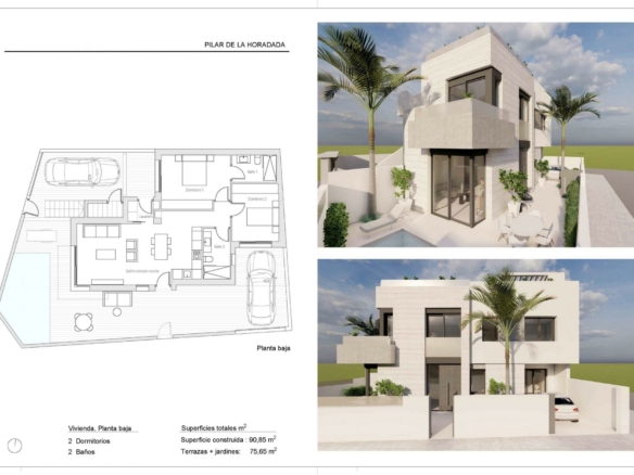 Exclusieve nieuwbouwwoningen met privézwembad in Pilar de la Horadada Modern wonen op een toplocatie aan de Costa Blanca Ontdek een exclusief nieuwbouwproject van slechts twee premium bungalows in het hart van Pilar de la Horadada, een charmant kustplaatsje aan de Costa Blanca dat bekend staat om zijn fijne zandstranden, rustige sfeer en mediterrane levensstijl. Het wooncomplex ligt op slechts 2,5 km van het strand en op loopafstand van supermarkten, winkels, restaurants en essentiële dagelijkse voorzieningen. Met uitstekende wegverbindingen en de luchthaven van Alicante op slechts 45 km afstand, biedt deze locatie de perfecte balans tussen rust, comfort en bereikbaarheid. Twee unieke woningen ontworpen voor comfort Het project omvat twee elegante woningen met 2 slaapkamers en 2 badkamers, ontworpen met hoogwaardige afwerkingen en moderne indelingen. Een van de badkamers is ensuite, wat extra privacy en gemak biedt. Elke woning biedt zijn eigen onderscheidende buitenbeleving, afgestemd op verschillende levensstijlvoorkeuren. Bungalow op de begane grond met ruime tuin en privézwembad De woning op de begane grond heeft een royale tuin van 75 m2, ideaal om buiten te eten, te zonnen en te ontspannen. Er is een privézwembad en een eigen parkeerplaats op het perceel. Grote ramen en open ruimtes zorgen voor een lichte en uitnodigende sfeer in het hele huis. Penthouse-bungalow met privésolarium en zwembad De woning op de bovenste verdieping heeft een omheinde parkeerplaats op de begane grond en is toegankelijk via een buitentrap. Het beschikt over een ruim terras en een privésolarium op het dak met een eigen zwembad, waardoor het een exclusief toevluchtsoord is om te genieten van het mediterrane klimaat en het weidse uitzicht. Levensstijl in Pilar de la Horadada Deze kustgemeente staat bekend om zijn rustige en ontspannen sfeer, prachtige stranden zoals Mil Palmeras en een breed scala aan buitenactiviteiten. Snorkelen, duiken, kustwandelingen en fietsen maken deel uit van de dagelijkse levensstijl van zowel bewoners als bezoekers. Natuurliefhebbers zullen de nabijheid van de zoutmeren van San Pedro, op ongeveer 12 km afstand, met hun schilderachtige landschappen en wilde dieren zeker waarderen. Afstanden tot belangrijke bezienswaardigheden Strand: 2,5 km Zoutmeren van San Pedro: 12 km Lo Romero Golf: 6 km Luchthaven Alicante: 45 km Luchthaven Murcia: 40 km Torrevieja: 20 km Verzeker u vandaag nog van uw exclusieve woning Grijp deze kans om een unieke woning met uitzonderlijke buitenruimtes te bezitten in een van de meest gewilde gebieden van de Costa Blanca. Neem vandaag nog contact met ons op om een bezichtiging te regelen en uw nieuwe woning in Pilar de la Horadada te reserveren.