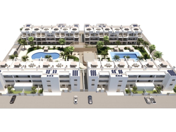 Moderne nieuwbouwappartementen in San Cayetano, Torrepacheco, Murcia Eigentijds wonen in een rustige mediterrane omgeving Dit exclusieve nieuwe wooncomplex ligt in San Cayetano, Murcia, onderdeel van de gemeente Torre Pacheco, op slechts 9 km van de zee en omgeven door verschillende gerenommeerde golfbanen. Het project combineert rust, comfort en eigentijds design en biedt een ideale omgeving voor permanent wonen, vakantiegebruik of investering aan de Costa Calida. Het project bestaat uit 72 appartementen met 2 en 3 slaapkamers en 2 badkamers, waarvan één ensuite, verdeeld over vier moderne gebouwen. Er is ook een tweede fase met bungalows en villa’s gepland, wat de waarde en aantrekkingskracht van het gebied nog verder vergroot. Ontworpen gemeenschappelijke ruimtes voor ontspanning en welzijn Bewoners kunnen genieten van zorgvuldig aangelegde gemeenschappelijke ruimtes met twee zwembaden, prachtige tuinen en een volledig uitgeruste fitnessruimte. Deze ruimtes creëren een aangename en sociale omgeving waar buren kunnen ontspannen, sporten en genieten van de mediterrane levensstijl. Het wooncomplex beschikt ook over 40 kW aan fotovoltaïsche zonnepanelen die helpen de elektriciteitskosten van de gemeenschap te ondersteunen en bijdragen aan een duurzamere en energiezuinigere leefomgeving. Appartementen met privébuitenruimtes en solarium Elk appartement is ontworpen om optimaal te profiteren van het buitenleven. De woningen op de begane grond hebben een privétuin, de appartementen op de eerste verdieping hebben een ruim terras en de woningen op de bovenste verdieping hebben zowel een terras als een privé-solarium op het dak. Alle woningen hebben een zomerkeuken op het terras of solarium, perfect om het hele jaar door van de zon te genieten. Alle woningen zijn voorzien van een parkeerplaats buiten en een privéberging in de kelder, wat extra gemak en functionaliteit biedt. Kwaliteitsvoorzieningen en energiezuinige installaties Deze nieuwbouwwoningen worden opgeleverd met een hoogwaardige afwerking en moderne installaties die comfort en functionaliteit garanderen, waaronder: Volledig ingerichte keuken met apparatuur Volledig uitgeruste badkamers met meubilair, spiegel, verlichting en doucheschermen Voorbereiding voor airconditioning met luchtkanalen Aerothermisch systeem voor warm water De combinatie van moderne materialen en energiezuinige systemen maakt deze woningen ideaal voor gebruik het hele jaar door. Uitstekende locatie dicht bij golf, stranden en voorzieningen San Cayetano is een rustig en goed bereikbaar dorp met lokale voorzieningen, winkels en diensten. Dankzij de strategische ligging zijn de stranden, golfbanen en belangrijke vervoersverbindingen gemakkelijk bereikbaar. Belangrijke afstanden tot bezienswaardigheden zijn onder andere: Stranden van Mar Menor 9 km Roda Golf 6 km La Serena Golf 14 km Los Alcazares 10 km Cartagena 30 km Luchthaven Murcia Corvera 25 km Luchthaven Alicante 90 km Verzeker u vandaag nog van uw woning in San Cayetano Dit moderne wooncomplex biedt een uitstekende gelegenheid om te genieten van het mediterrane leven in een rustige maar goed bereikbare omgeving. Neem vandaag nog contact met ons op voor meer informatie en reserveer uw nieuwbouwappartement in San Cayetano. 365