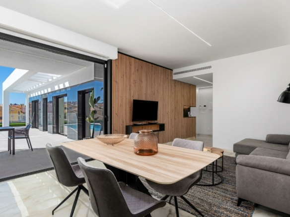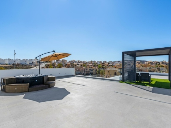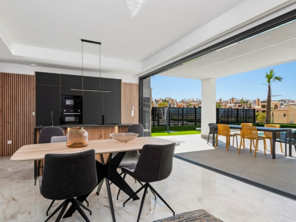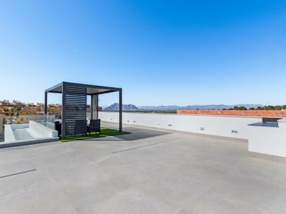 Nieuwbouwwoningen in La Finca Golf, Algorfa Exclusieve gelijkvloerse villa’s naast de Golf La Finca in Costa Blanca Zuid Ontdek dit exclusieve nieuwbouwproject van 11 onafhankelijke villa’s in het prestigieuze La Finca Golf Resort in Algorfa, een van de meest gewilde gebieden van de Vega Baja, Costa Blanca Zuid. Omgeven door groene landschappen, citrusboomgaarden en glooiende fairways, biedt deze locatie rust, privacy en een hoogwaardige mediterrane levensstijl, terwijl alle essentiële voorzieningen en attracties aan de kust binnen handbereik blijven. Moderne gelijkvloerse villa’s met privézwembad en solarium Elke villa is zorgvuldig ontworpen op één niveau en biedt overal comfort en functionaliteit. De woningen beschikken over 3 ruime slaapkamers en 2 moderne badkamers, een open Amerikaanse keuken en een lichte woon- en eetkamer met grote ramen die direct uitkomen op het terras en de privétuin. Buiten beschikt elke villa over een privézwembad, een parkeerplaats op het perceel en een indrukwekkend privésolarium van 150 m², ideaal om het hele jaar door van de zon te genieten. Voor kopers die op zoek zijn naar extra ruimte, is er de mogelijkheid om tegen meerprijs een kelder of een vierde slaapkamer op een hoger niveau toe te voegen, zodat u de woning aan uw persoonlijke behoeften kunt aanpassen. Hoogwaardige specificaties en elegante afwerking Deze villa’s zijn gebouwd met hoogwaardige materialen en afwerkingen om comfort, efficiëntie en een moderne stijl te garanderen. Tot de kenmerken behoren een versterkte veiligheidsdeur, gemotoriseerde rolluiken, volledig ingerichte keukens met apparatuur en badkamers met meubilair, spiegels en doucheschermen. Het solarium op het dak wordt geleverd met een zomerkeuken en pergola, waardoor het de perfecte omgeving is om buiten te eten en te ontspannen. Een LED-verlichtingspakket voor binnen en buiten is ook inbegrepen, wat zowel het ontwerp als de sfeer verbetert. Toplocatie in La Finca Golf Resort La Finca Golf Resort staat bekend om zijn kampioenschapsgolfbaan, luxe hotel, spafaciliteiten, restaurants en sportterreinen, allemaal gelegen in een veilige en goed onderhouden omgeving. Algorfa is een charmant Spaans dorpje met een ontspannen sfeer, lokale winkels en traditionele restaurants, terwijl nabijgelegen steden een breder scala aan diensten bieden. Belangrijkste afstanden La Finca Golf Club: op het terrein Stranden van Guardamar del Segura: 15 km Winkelcentra van Torrevieja en Orihuela Costa: 15 km Almoradi, Benijofar en Ciudad Quesada: 5 tot 10 km Internationale luchthaven van Alicante: 35 km Mediterrane levensstijl en slimme investering Met meer dan 300 dagen zon per jaar, uitstekende wegverbindingen en de nabijheid van stranden, golfbanen en winkelgebieden, zijn deze villa’s ideaal als permanente woning, vakantiehuis of investeringsmogelijkheid aan de Costa Blanca. Verzeker u vandaag nog van uw nieuwe villa in La Finca Golf Mis deze kans niet om een moderne villa te bezitten in een van de meest exclusieve golfresorts in Algorfa. Neem vandaag nog contact met ons op voor meer informatie of om een privébezichtiging te regelen.